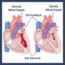 Mitral kapak yaprakçıklarının birbirine yapışması, sonucunda kan daralmış mitral kapaktan rahat geçemez ve sol kulakçıkta olması gerekenden daha fazla kan birikir ve pek çok dolaşım problemine sebep olur.
